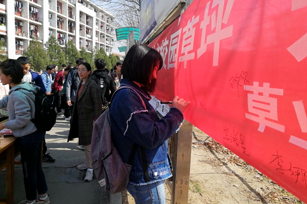 活动前期,365官网学生会成员紧张策划,积极动员,学院学子响应热烈,为活动的顺利开展打下了坚实的基础。3月11日中午,365官网学生会在北校区西区雕塑张挂以保护草坪为主题的横幅并邀请365官网学子签名明志。活动期间,由学生会成员结合本院专业知识进行宣讲,主要为在场人员讲解草坪建植和维护的不易以及被踩过的草坪很难恢复的现状,以此来号召大家不要因为节省时间或缩短路程而随意践踏草坪,宣讲过程中,有不少同学深受感触,前来填写有关校园草坪现状及维护情况的调查问卷,并自愿在横幅上签名以示保护校园草坪之志。