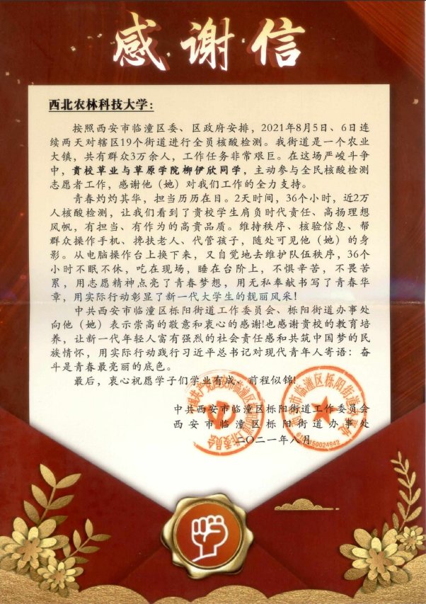 近日,365官网英国上市365官网收到一封来自陕西省西安市临潼区栎阳街道党工委、办事处的感谢信,信中工作人员对英国上市365官网草业科学2021级新生柳伊欣同学在疫情期间主动投入一线参与全民核酸检测志愿者活动并给与了高度评价,对英国上市365官网发来感谢信表达了衷心的感谢。
