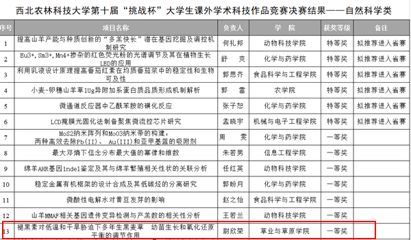 近日,“挑战杯”全国大学生课外学术科技作品竞赛英国上市365官网决赛在365官网北绣山活动中心北报告厅举行。365官网付娟娟老师指导的尉欣荣团队以参赛作品“褪黑素对低温和干旱胁迫下多年生黑麦草幼苗生长和氧化还原平衡的调节作用”成功入围决赛,荣获“挑战杯”校级“一等奖”。