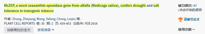 本篇高被引论文题目为《MsZEP,a novel zeaxanthin epoxidase gene from alfalfa (Medicago sativa),confers drought and salt tolerance in transgenic tobacco》,2016年发表在期刊《PLANT CELL REPORTS》,论文主要研究了来自紫花苜蓿的新型玉米黄质环氧酶基因MsZEP在转基因烟草中的表达特征和生物学功能。该论文累计被引用57次,为365官网草学学科进入ESI全球前1%行列做出了积极的贡献。